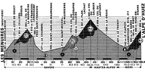 11h03 (Savoie) : Les Menuires - Moutiers - Aigueblanche (km 0) - Saint-Oyen (km 3) - Doucy (km 8) - Côte de Doucy (km 12.5-sprint) - La Thuile (km 16.5) - Celliers (km 17.5) - Celliers-Dessus (km 18.5) - Col de la Madeleine (km 28-GPM1) - Saint-François-Longchamp (km 32.5) - Saint-François (près de) (km 35.5) - Le Planet (km 37.5) - Saint-Martin-la-Chambre (km 44) - La Chambre (km 46) - Pontamafrey (près de) (km 52) - Saint-Jean-de-Maurienne (km 57) - Saint-Michel-de-Maurienne (km 71-sprint) - Saint-Martin-d'Arc - Col du Télégraphe (km 82.5-GPM2) - Valloire (km 87.5-ravitaillement) - Les Verneys - Plan-Lachat (km 96.5) - Col du Galibier (km 105.5-GPM.HC-S.H.D) - (Hautes-Alpes) : Col du Lautaret (km 113.5) - La Grave (km 124.5) - (Isère) : Le Freney (km 140.5) - Le Clapier (km 147.5) - Carr. N.91-D.211 (km 151.5-sprint) - La Garde (km 155) - Le Ribot (km 157.2) - Huez-en-Oisans (km 161.1) - L'Alpe-d'Huez / Av. du Rif-Nel (km 166.5).