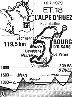 - Le sprint du rush de Lavaldens (km 45) est réglé par Tesnière le leader de ce classement et lanterne rouge du Tour. Oliva remet ça dans le petit col de Marissol (km 53.5) et passe en tête avec 22" d'avance sur Battaglin, Legeay, Le Guilloux et le reste du peloton. L'Espagnol attend le peloton au contrôle de ravitaillement de Valbonnais. Rien à signaler dans le col d'Ornon où Bourreau passe le premier au sommet (km 91) devant Battaglin et Martinez. Par contre, Gery Verlinden, le champion de Belgique et 6ème au classement général est le seul lâché Il revient dans la descente (ainsi que Van Impe, victime d'une crevaison) mais abandonnera plus loin. A Bourg-d'Oisans (km 104), Tesnière gagne le dernier sprint devant Le Guilloux et c'est un peloton compact qui entame la montée vers l'Alpe d'Huez.