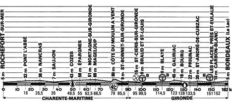12h40 (Charente-Maritime) : Rochefort-sur-Mer (km 0) - D733 Martrou (km 1.5) - Saint-Agnant (km 6.5) - D125 Razou (km 11.5) - D117 Pont-1'Abbé (km 16) - Nancras (km 26.5) - Sablonceaux-Saint-André (km 29.5) - N150 Saujon (km 36) - Grézac (km 47) - Cozes (km 49.5) - D246 Epargnes (km 55) - Mortagne-sur-Gironde (km 62.5) - D145 Mageloup (km 66.5) - Saint-Port-sur-Gironde (km 69) - Saint-Dizant-du-Gua (km 73.5) - Conac (km 78.5) - Côte du Moulin-à-Vent (km 79-GPM4) - Saint-Thomas-de-Conac (km 80) - Saint-Sorlin-de-Conac (km 83.5) - St-Bonnet-sur-Gironde (km 85.5) - (Gironde) : Saint-Ciers-sur-Gironde (km 95-ravitaillement) - D9 Braud et Saint-Louis (km 99.5-rushB) - Saint-Androny (près de) (km 107) - Blaye (km 114.5-rushB) - D669 Plassac (km 117.) - Gauriac (km 123) - Bayon (km 124.5) - Saint-Seurin (km 126) - Bourg (km 128) - La Lustre (km 131.5) - Prignac (km 134.5) - St-André-de-Cubzac (km 140) - D910 Cubzac-les-Ponts (km 142) - Saint-Vincent-de-Paul (km 144.5) - La Grave-d'Ambarès (km 147) - Les Places près Sainte-Eulalie (km 150.5-rushB) - D10E Carbon-Blanc (km 152) - D10 Lomont (km 157) - A63 pont d'Aquitaine (km 159.5) - Bordeaux / Le Lac, circuit parc des expositions (km 162).