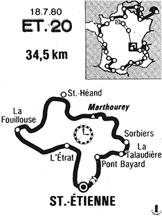Départs de 3' en 3' devant le stade Geoffroy-Guichard et arrivées devant ce stade. Premier départ : Schönbacher à 12h00, dernier : Zoetemelk à 16h12.