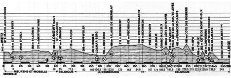 9h50 (Moselle) : Metz - Sainte-Marie-aux-Chênes (km 0) - (Meurthe et Moselle) : N381 Auboué (km 2.5) - Briey (km ) - Côte de Briey (km 11 - GPM4) - D906 Avril (km 14.5) - Trieux (km 20-rush) - Audun-le-Roman (km 27) - D57 Serrouville (km 30.5) - D16 Fillières (km 34) - D952 Morfontaine (km 40) - D125 Laix (km 40) - D25 Chenières (km 46) - Longwy-Bas (km 55) - Longwy-Haut (km 58-rushB) - D918 Mont-Saint-Martin (km 60.5) - (BELGIQUE) - Aubange (km 65-rush) - N483 Messancy (km 67) - Arlon (km 77.5) - N44 Galchef (km 82) - (LUXEMBOURG) - Saeuf (km 92) - Brouch (km 95) - Mersch (km 102.5-rush) - La Rochette (km 112.5) - Diekirch (km 124.5-ravitaillement) - Falaise de Grengley (km 134-GPM4) - Hoscheid - Schinkert (km 142.5) - Hosingen (km 145) - Heinerscheid (km 154.5) - Weiswampach (km 160) - Wemperhaardt (km 162) - Schmiede (km 168) - (BELGIQUE) - N33 Deyfeldt - Salmchâteau (km 182) - Vielsalm (km 183.5) - Grand Halleux (km 190) - Côte de Wanne (km 195-GPM3) - Stavelot (km 201-ravitaillement) - Côte de la Haute-Levée (km 202.5-GPM4) - N32 Francorchamps (km 208.5) - Côte des Rosiers (km 218-GPM3) - Spa (km 224.5) - Theux (km 232) - Côte de Mont-Theux (km 237-GPM4) - Lonveigné (km 239) - Côte des Forges (km 244.5-GPM4) - Beaufays (km 246) - Liège / pont Albert-Ier (km 258.5) - Liège / av. Malvoz (km 267.5).