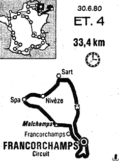 9h56 (BELGIQUE) - Circuit de Spa-Francorchamps (km 0) - 32/440 carr. Liège-Spa. Les Bruyères (km 1.3) - Carrefour Spa-Liège (km 1.6) - Carrefour Verviers (km 2.5) - Sart-lès-Spa (km 4.7) - VO. carrefour Wayai (km 7.1) - Wayai (km 7.9) - Carrefour Spa (km 9.3) - Nivèze (km 11) - Spa (km 15.6) - Spa / centre (km 16.4) - Spa / sortie (km 17.9) - N32 Côte de la Malchamps (km 22.3-GPM3) - Francorchamps (km 25.5) - Entrée du circuit de Francorchamps (km 26.6) - Spa-Francorchamps / stand n° 8 (km 33.4)