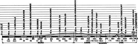 11h10 (Nord) - Lille - Loos (km 0) - D147 Wattignies (km 3.3) - La Neuville (km 20.5) - D954 Thumeries (km 22.5) - D8 Moncheaux (km 26.5) - Raimbeaucourt (km 28.5) - D938 Flines-Ies-Râches (km 35) - D47 Marchiennes (km 46) - Wandignies-Hamages (km 49.3) - D130 Erre (km 53) - D13 Hornaing (km 55.5) - Helesmes (km 57) - D955 Denain (km 63-rush) - N30 Haulcin (km 67.5) - D40 Thiant (km 70) - D88 Monchaux-sur-Ecaillon (km 75.5) - D40 Verchain-Maugré (km 79) - Saulzoir (km 83) - Montrécourt (km 83.8) - Kaussy (km 86.5) - Saint-Python (km 90) - Quievy (km 95) - D134 Viesly (km 98) - Inchy (km 101.3) - Troisvilles (km 103) - Maurois (km 107.5) - Busigny (km 113) - (Aisne) : D8 Bohain-en-Vermandois (km 119) - Fresnoy-le-Grand (km 124) - Bellecour (km 131) - Lesdins (km 133) - Saint-Quentin (km 140.5-ravitaillement) - Dallon (km 144) - Fontaines-les-Clercs (km 146) - Happencourt (km 150) - Tugny-et-Pont (km 153.5) - Dury (km 154.5) - Pithon (km 158.5) - (Somme) : Ham (km 160.5-rush) - Eppeville (km 163) - D186 Esmery-Hallon (km 166.5) - (Oise) : Libermont (km 171.5) - D128 Freniches (km 175) - D39 Frétoy-le-Château (km 177.5) - Campagne (km 180) - Catigny (km 181.5) - Lagny (km 185) - Plessis-Cacheleux (km 188) - D938 Dives (km 189.5) - Thiescourt (km 192) - Côte de Thiescourt (km 195-GPM4) - Ribecourt (km 201) - D40 Bailly (km 205.5) - D165 Saint-Léger-aux-Bois (km 207.5) - Carr. du Puits d'Orléans (km 210) - D130 Choisy-au-Bac (km 214-rush) - D 66 carr. de l'Industrie (km 218.5) - Compiègne / cours Guynemer (km 219.5).