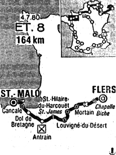 - Au km 128, Le Guilloux place un démarrage. Il prend une centaine de mètres d'avance. Van Vliet le rattrape un peu plus loin puis le peloton au km 130. En vue de Cancale, km 142.5, à 22 bornes du but, Thurau, Oosterbosch, Levavasseur, Delcroix et Legeay prennent 35". Levavasseur part seul. Oosterbosch revient sur lui mais le groupe des cinq se reconstitue à 19 kilomètres de l'arrivée. Ils ont 15" d'avance aux 12 kilomètres. Quand Delcroix attaque, Thurau est à la parade mais il est contré par Oosterbosch qui s'en va à son tour. Delcroix et Legeay sont distancés, Oosterbosch passe le dernier rush seul en tête. Le peloton est à 23". Dans le 1er tour de circuit, Legeay et Delcroix rejoignent Thurau et Levavasseur.