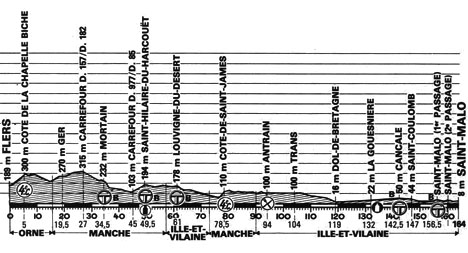 12h38 (Orne) : Flers (km 0) - D25 Côte de la Chapelle Biche (km 5.5-GPM4) - Larchamp (km 10) - Le Biot (km 12.5) - Beauchêne (km 14) - (Manche) : D157 Ger (km 19.5) - Le Bouillonné (km 23) - Les Giganières (km 27) - Le Neufbourg (km 32.5) - Mortain (km 34.5-rushB) - Parigny (km 47) - Saint-Hilaire-du-Harcouët (km 49.5-rushB) - (Ille-et-Vilaine) : Louvigné-du-Désert (km 61-rushB) - Meilé (km 66.5) - Saint-Georges-de-Reintembault (km 71) - (Manche) : Côte de St-James (km 78.5-GPM4) - D12 Argouges (km 85) - La Chesnée (km 87.5) - (Ille-et-Vilaine) : D15 Antrain (km 94-ravitaillement) - D155 Trans (km 104) - La Boussac (km 110) - Dol-de-Bretagne (km 119) - D4 La Fresnais-La Pigassière (km 127.5) - La Gonesnière (km 132) - Les Portes-Rouges (km 137.5) - Terrelabouët - Cancale (km 142.5-rushB) - D355 Saint-Coulomb (km 147) - D301 Saint-Malo-Saint-Servan (km 153) - Entrée du circuit (km 155.3) - Saint-Malo/1er passage (km 156.6-rushB) - Saint-Malo/2ème passage (km 160.3) - Saint-Malo / bd. Léonce Demalvilain (km 164).