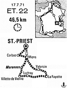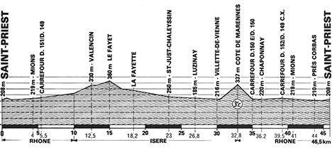 9h55 à 15h25 (Rhône) : Saint-Priest / Bd. E.Herriot (km 0) - D151 Mions (km 4) - D151 Carr. D149 (km 5.5) - (Isère) : D53 Valencin (km 12.5) - D53 Le Fayet (km 15) - La Fayette (km 18.2-chrono) - D36 Saint-Just-Chaleyssin (km 23) - Luzinay (km 26.8) - Villette de Vienne (km 30) - Côte de Marennes (km 32.8-GPM3-chrono) - (Rhône) : D150 Chaponnay (km 36.2) - Mions (km 41) - C6b Corbas (près de) (km 44) - D148 - Saint-Priest / pont de la gare (km 45.2) - Bd. Herriot (km 46.2) - Saint-Priest /Bd. E. Herriot (km 46.5).