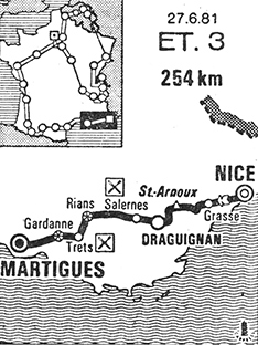 - Kim Andersen provoque une autre cassure et au panneau des 15 km, Andersen, De Cnijf, Van der Velde & Didier possèdent 28". De Cnijf remporte le dernier sprint au 1er passage sur la ligne d'arrivée de Martigues (km 249). Un contre lancé par Bernaudeau échoue et au second passage sur la ligne, Van der Velde se dégage. Il est rejoint par Lucien Didier mais le Néerlandais remporte l'étape facilement. Le peloton arrive 25" plus tard.
