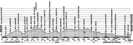 9h41 (Alpes-Maritimes) : Nice - Villeneuve-Loubet (km 0) - N7 Carr. D4 La Bargue (km 4) - D4 Biot (km 7.5) - D3 Valbonne (km 17) - Plascassier (près de) (km 19.5) - D4 Carr. D404 (km 20) - Grasse (km 27.5) - D2562 Peymeinade (km 33) - D2562 Carr. D11 (km 35) - (Var) : D562 Carr. D37 (km 45) - D562 Carr. D19 (km 50) - D19 Fayence (km 53.5) - Seillans (km 58) - Col de Saint-Arnoux (km 64-GPM3) - Bargemon (km 71) - D25 Callas (km 78) - D225 - D562 - Draguignan (km 94-E.V.) - D557 Flayosc (km 100.5) - D557 Carr. D10 (km 108.5) - Salernes (km 115-ravitaillement) - D560 Sillans-la-Cascade (km 122.5) - D560 Carr. D32 (km 126.5) - D32 Le Logis (km 131.5) - D71 Tavernes (km 138.5) - D554 Varages (km 143.5) - D561 Saint-Martin (près de) (km 151) - Esparron (km 154) - Rians (km 162-sprint) - D3 Carr. D23 (km 165) - D23 Carr. D223 (km 169.5) - Pourrières (km 176) - D23 Carr. N7 (km 179.5) - (Bouches-du-Rhône) : D6 Carr. N8b (km 184.5) - Trets (km 185.5) - D6 Carr. D56b (km 190) - passage autoroute (km 196) - Gardanne (près de) (km 204-sprint) - D6 Carr. D59 (km 209.5) - La Malle (km 212.5) - Les-Pennes-Mirabeau (km 216) - N568 Carr. D20 (km 223.5) - Gignac-la-Nerthe (km 225) - N568 Carr. D9 (km 232.5) - Châteauneuf-les-Martigues (près de) (km 235) - Martigues / 1er passage (km 244-sprint) - 2ème passage (km 249-GPM4) - Martigues / Chemin des Rayettes (km 254).