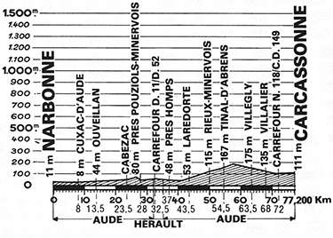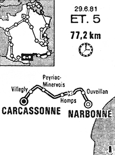 13h45 à 14h55 (Aude) : Narbonne / Pl. de l'Hôtel de Ville (km 0) - D913 Cuxac-d'Aude (km 8) - D13 Ouveillan (km 18.3) - Carr. La Croisade (km 16.5) - D5 Cabezac (km 23.5) - Pouziols-Minervois (près de) (km 28) - (Hérault) : D11 Carr. D52 (km 32.5) - (Aude) : Homps (près de) (km 37) - D11 La Redorte (km 43.5) - Rieux-Minervois (km 50) - Tinal-d'Abrens (km 54.5) - D11 Carr. D620 (km 58) - D620 Villegly (km 63.5) - Villalier (km 68) - D620 Carr. D118 (km 71) - N118 Carr. CD149 (km 72) - Carcassonne / centre (km 75.5) - Carcassonne / vélodrome - 1er passage (km 76.750) - Carcassonne (km 77.2).