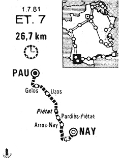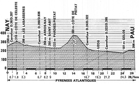 10h41 à 16h23 (Pyrénées-Atlantiques) : Nay / Pl. du Marcadieu (km 0) - D36 Carr. D287 (km 0.7) - D287 Côte de Céleste (km 1.8) - D287 Carr. C11 (km 2.5) - C11 Les Labassères (km 3.3) - D288 Carr. D936 (km 6.7) - D936 Carr. D37 (km 7.7) - D37 Arros-Nay (km 8.2) - Saint-Abit (km 9) - Pardiès-Piétat (km 10) - D24 Côte de Piétat (km 13.9-GPM3) - D24 Carr. D322 (km 16.7) - D322 Uzos (km 19.3) - D322 Carr. D285 (km 21.2) - D285 Carr. D209 (km 23.6) - D209 Gelos (km 24.3) - Carr. de la Croix du Prince (km 24.7) - N134 Pau / Pl. de Verdun (km 26.7).