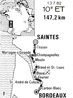 - Vallet passe en tête la côte du Moulin (km 58). Dès le début de la descente, Bazzo démarre et entraine Nilsson & Luyten. D'autres coureurs se lancent à leur poursuite. Encore une fois le peloton les reprend tous sauf Bazzo qui insiste et qui est renforcé par Brun au km 68 mais ce sera peine perdue. Pevenage se distingue encore et 11 hommes se dégagent : Pevenage, Luyten, Seznec, Le Guilloux, Gauthier, Clerc, Winnen, Rodriguez, Nulens, Jourdan & Wijnants. Au km 78, ils possèdent 30" d'avance et le rush Talbot de Brault-St-Louis (km 79) est gagné par Seznec devant Le Guilloux. Au km 81, les "onze" possèdent 1'36" sur un peloton qui roule sans à-coups mais les Renault d'Hinault prennent les choses en main. Au km 90, l'écart est de 1'54", idem au ravitaillement de Blaye (km 93). C'est Jourdan qui passe en tête la côte de Gruzac devant Seznec. Au km 114, le peloton est revenu à 1'00" et 20" à St-André-de-Cubzac (km 117) où il reste 30 kilomètres à parcourir.