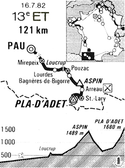 - A Campan (km 69), l'écart est descendu à 2'20" puis 2'00" au km 72 et 1'43" à Ste-Marie de Campan (km 74). Du peloton décrochent Raas, Chamel, Duclos-Lassalle etc. Au km 78, dans la montée vers le col d'Aspin, Laurent ne possède plus que 1'20" puis 56" au km 80 et 45" à 4 kilomètres du sommet. Michel Laurent parvient néanmoins à basculer en tête au col (km 86) alors que Vallet et Breu passent à 10". A 20" Hinault conduit un peloton très réduit.