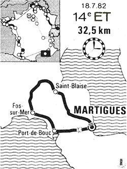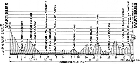 11h10 à 15h48 (Bouches-du-Rhône) : Martigues/sommet Côte des Rayettes (km 0) - D50c - D50b Port-de-Bouc (km 6.5) - N568 Carr. "Ma Campagne" (km 9.5) - D51b Fos-sur-Mer (km 10.5) - Carr. les Valins (km 12) - N569 - D51 Saint-Blaise (km 21) - D51a - D50 - Martigues/Av. Fr. Turcan (km 29.8) - Carr. Chemin des Rayettes (km 31.5) - Martigues/Côte des Rayettes (km 32.5-GPM4).