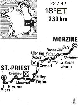 - Les ascensions et sprints rythment la première moitié de l'étape. La montée vers Les Gets est régulière et Bernaudeau devance Vallet au sommet (km 7). Les positions sont les mêmes au col de Châtillon au km 22. A La Roche-sur-Foron (km 45), le 1er sprint de la journée est remporté par Willems devant Rault. Le peloton aborde ensuite une succession de côtes de 3° et 4° catégories : col d'Evires (km 52.5) où Bolle devance Bernaudeau, côte de Groisy (km 65.5) où Bernaudeau est devant Vallet, côte de Droisy (km 95.5) et Bernaudeau s'impose encore devant Vallet. Au km 134, au "rush" de Belley, Van de Wiele part de loin et Kelly ne peut le remonter mais il ne se laisse pas surprendre à celui de Peyrieu (km 142) où il bat Willems. Entre temps, au km 137, Demierre avait tenté la fuite avec Le Bigaut puis Poisson, Van Vlierberghe et Peeters mais sans succès. Peu après une chute se produit dans le peloton avec pour principale victime Dal Pian contraint à l'abandon.