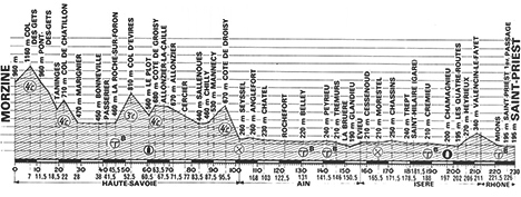 10h18 (Haute-Savoie) : Morzine/D128 (km 0) - D202 Col des Gets (km 7-GPM4) - Les Perrières (km 8.5) - Pont-des-Gets (km 11.5) - Avonnex (km 15) - Tanninges (km 18.5) - Col de Châtillon (km 22-GPM4) - D6 Marignier (km 28) - D19 Bonneville (km 38) - N203 Toisinges (km 39) - Passerier (km 41.5) - Vozerier (km 43.5) - La-Roche-sur-Yon (km 45.5-sprint) - Col d'Evires (km 52.5-GPM3) - Le Plot (km 60.5) - D2 Groisy (km 62.5) - Côte de Groisy (km 62.5-GPM4) - Villy-le-Pelloux (km 66) - Allonzier-la-Caille (km 678.5) - Allonzier (km 69) - Avrégny (km 71.5) - Arthaz (km 73) - Cercier (km 77) - Bonlieu (km 82) - D7 Sallenoues (km 83.5) - D197 Chilly (km 87.5) - Mannecy (km 90) - D17 La-Croix-Rouge (km 92) - Clermont (km 93) - D57 Côte de Droisy (km 95.5-GPM4) - Seyssel (km 102) - (Ain) : Seyssel (ravitaillement) - Anglefort (km 108) - Châtel (km 113) - Rochefort (km 122.5) - N504 Belley (km 131-sprint) - D992 Peyrieu (km 141.5-sprint) - Tremurs (km 146) - Murs (km 148) - D19 La Bruere (km 150.5) - Bregnier (km 151.5) - Glandieu (km 152.5) - D10 Evieu (km 157) - (Isère) : D33 Cessenoud (km 160) - Le Bouchage (km 162) - Le Mollard (km 163) - Morestel (km 165.5-ravitaillement) - D517 Passins (km 169.5) - Chassins (km 171.5) - Sablonnières (km 174.5) - Trept (km 178.5) - Saint-Hilaire (km 181.5) - Crémieu (km 189-sprint) - Chamagnieu (km 197) - Le Chaffard (km 199) - Les-Quatre-Routes (km 202) - D76 Heyrieux (km 206) - D53a Valencin (km 213) - (Rhône) : D151 Mions (km 221.5-sprint) - D148 Saint-Priest/1er passage (km 221.5) - Saint-Priest/Bd. Edouard Henriot (km 230).