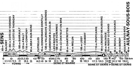 75.5) - D135 Chartrettes (km 81) - D39 Vaux-le-Pénil (km 85) - Melun (km 87-ravitaillement) - D35 Voisenon (km 91) - N371 Lissy (km 99) - Soignoles (km 102) - Coubert (km 103.5) - Pontcarré (km 117.5) - Croissy-Beaubourg (km 124.5) - D128 - D406 Malnoue (km 130.5) - (Seine-Saint-Denis) : Noisy-le-Grand (km 133) - (Val-de-Marne) : D33 Villiers-sur-Marne (km 134) - (Seine-Saint-Denis) : D33 Noisy-le-Grand (km 133-sprint) - Neuilly-sur-Marne (km 139.5) - D30 Neuilly-Plaisance (km 141.5-sprint) - Rosny-sous-Bois (km 143.5) - Noisy-le-Sec (km 145.5) - Bondy (km 148-sprint) - N370 Aulnay-sous-Bois/entrée circuit (km 155) - Aulnay-sous-Bois (km 155.6-sprint) - Aulnay-sous-Bois/1er passage (km 156.8) - Aulnay-sous-Bois/Rue Paul Cézanne (km 159).