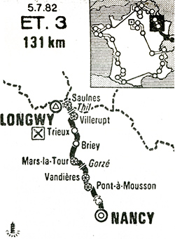 - Après une vaine attaque de Le Bigaut, le sprint et les bonifications de Pont-à-Mousson (km 27) sont très disputés entre Kelly, Anderson, Hinault et Rault. Le maillot jaune s'impose. Par contre, à Vandières (km 35), Hinault se dégage à 100 mètres de la ligne et s'impose nettement devant Thurau alors qu'Anderson a failli chuté. Jusqu'à la côte de Gorze (km 41), seul Braun se distingue mais là-aussi sans succès. Fait étrange dans l'histoire du Tour, un "panneautage" incertain dans cette côte provoque deux sprints qui seront tous deux validés par les commissaires : un au point le plus haut et le deuxième (le vrai) un kilomètre plus loin.