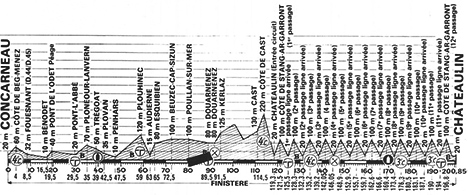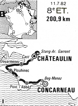 donne également Clère devant Planckaert (à 6') tandis que le peloton est à plus de 10'. Encore les mêmes pour le sprint de Douarnenez (km 92), les écarts étant de 10'46" et 12'47". Le peloton a mis en route avec les Peugeot et le maillot jaune aux avants-postes. Au km 116, Clère remporte le grimpeur de Cast (km 116) avec 11'30" d'avance malgré un changement de roue.