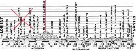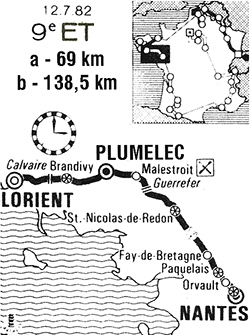 était LORIENT - NANTES, 196.5 km. Elle passait par Plumélec et la côte de Cadoudal.