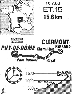 (Puy-de-Dôme) : D68 Clermont-Ferrand (km 0) - Chamalières (km 1.6) - Royat (km 4.6) - Côte du Parc Naturel (km 8.1-GPM2) - La Font de l'Arbre (km 8.6) - N141A - Entrée route à péage (km 10.6) - Péage (km 11.6) - Le Puy-de-Dôme (km 15.6-GPM HC).