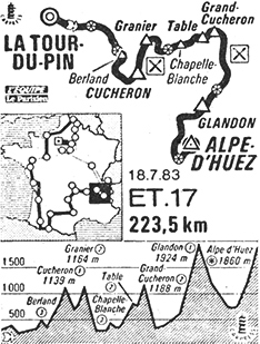 - Dans la dure montée du Glandon, ils sont tous revus par le groupe Van Impe, Delgado, Jimenez, Martin et Alban. Au sommet (km 173) : neuf coureurs en tête : Van Impe, Jimenez, Delgado, Van der Velde, Fignon, Corredor, Winnen, Madiot et Alban. A 10" Boyer, à 33" Agostinho, à 41" Breu. Bernaudeau est à 1'52" avec son équipier Durant, à 8'10" Zoetemelk, à 8'39" Millar, à 9'40" Arroyo, à 12'15" Kelly.