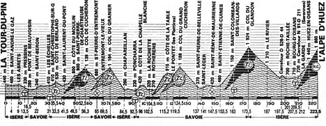 10h30 (Isère) : La Tour du Pin - N6 St-Didier-de-la-Tour (km 0) - St-André-le-Gaz (km 4) - Les Abrets (km 9) - Pressins (km 13.5-sprint) - Pont de Beauvoisin (km 16) - (Savoie) : Pont de Beauvoisin - Domessin (km 18.5) - St-Béron (km 22) - Les Echelles (km 31-rush) - (Isère) : D520 Entre deux Guiers (km 32) - D520C St-Christophe-sur-Guiers (km 33.5) - Côte de Berland (km 35.5-GPM3) - D520 St-Laurent-du-Pont (km 41.5) - D520B Côte du Moulin (km 49.5) - D512 St-Pierre-de-Chartreuse (km 52.5) - Col du Cucheron (km 56.5-GPM1) - St-Philibert (km 58.5) - St-Pierre-d' Entremont (km 65-ravitaillement) - (Savoie) : Entremont-le-Vieux (km 69.5) - D912 Col du Granier (km 74.5-GPM2) - (Isère) : D285 Chapareillan (km 84.5) - D9 La Gâche (km 91) - Pontcharra (km 92.5-rush) - (Savoie) : D288 Côte de la Chapelle-Blanche (km 96-GPM3) - D202 La Rochette (km 102.5) - D27 Rotherens (km 104.5) - D23 Côte de la Table (km 115-GPM2) - D207 Le Pontet-les-Plattires (km 119.5) - Col du Grand-Cucheron (km 124.5-GPM2) - St-Pierre-de-Belleville (km 137) - D74 St-Léger (km 141) - St-Rémy-de-Maurienne (km 147.5-ravitaillement) - St-Etienne-de-Cuines (km 153.5) - D927 Le Villard-Martinan (km 162.5) - St-Colomban-des-Villards (km 163-rush) - Col du Glandon (km 173.5-GPM1) - (Isère) : D526 Le Rivier (km 187) - D526 Rochetaillée (km 201) - N91 Bourg-d'Oisans (km 207.5-rush) - D211 La Garde (km 212) - Le Ribot (km 214.5) - Huez-en-Oisans (km 217.5) - L'Alpe d'Huez / av. Rif-Nel (km 223.5-GPM HC).