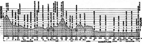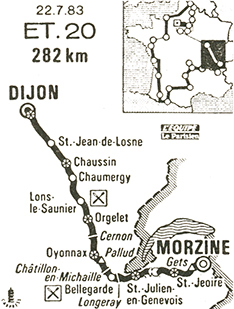 9h00 (Haute-Savoie) : D128 Morzine (km 0) - D902 Les Granges (km 2) - Côte des Gets (km 7-GPM3) - Les Perrières (km 9) - Toninges (km 19) - D907 Matringes (km 23.5) - Mieussy (km 25) - St-Jeoire-en-Faucigny (km 30.5-rush) - La Tour (km 32.5) - Ville-en-Salaz (km 34) - Viuz-en-Sallaz (km 35.5) - Pont de Fillinges (km 40.5) - D20 Arpigny (km 41.5) - D9 Findrol (km 43.5) - D19A L'Eculaz (km 47) - D19 Reignier (km 50) - Bas-Mornex (km 55) - Etrembières (km 56) - N206 Le Pas-de-l'Echelle (km 60) - Collonges-sous-Salève (km 65) - St-Julien-en-Genevois (km 69-rush) - Viry (km 74) - Essertet (km 75) - Valleiry (km 79.5) - Vulbens-Faramaz (km 82) - (Ain) : Côte de Longeray (km 93-GPM4) - Bellegarde (km 98.5-ravitaillement) - N84 Côte de Châtillon-en-Michaille (km 103.5-GPM4) - St-Germain-de-Joux (km 111) - D55 La Pallud Echallon (km 117) - Côte de la Pallud (km 121-GPM3) - D13 Oyonnax (km 129) - Dortan (km 137) - D936 Uffel (km 140) - (Jura) : D60E Chancia (km 141) - D 60 Côte de Cernon (km 160.5-GPM4) - D3 Onoz (km 158) - D470 Orgelet (km 168.5-rush) - La Thoreigne (km 171) - N78 Lons-le-Saunier (km 187-ravitaillement) - Montmorot (km 189) - D470 - Villevieux (km 199) - Bletterans (km 200) - D33 Relans (km 202) - Commenailles (km 207) - Chaumergy (km 211.5) - D468 La Chassagne (km 215.5) - Rye (km 217) - Les Essards (km 222) - Asnans (km 226) - Chaussin (km 228-rush) - Peseux (km 233) - St-Aubin (km 238) - (Côte d'Or) : D968 Maison-Dieu (km 246) - Losne (km 247.5) - St-Jean-de-Losne (km 248) - St-Usage (km 249) - Brazey-en-Plaine (km 254) - Aiserey (km 259.5) - Longecourt-en-Plaine (km 262.5) - Thorey-en-Plaine (km 265) - D996 Longvic (km 276) - Dijon / cours de Gaulle (km 278.5-rush) - Dijon / bd. Champollion (km 282).