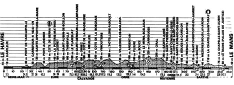 9h30 (Seine-Maritime) : Le Havre (km 0) - N182 Harfleur (km 3.5) - Pont de Tancarville (km 24.5) - (Eure) : Sainte-Opportune-la-Mare (km 36) - Bourdon (km 42.5) - Pont-Audemer (km 43.5) - Bernay (km 50) - Saint-Siméon (km 53) - La Noe-Poulain (km 55) - La Poterie-Mathieu (km 56) - Lieurey (km 59) - D28 St-Aubin-de-Scellon (km 66) - Le Louvre (km 69.5) - Thiberville (km 70) - D145 Le Planquay (km 75.5-rush) - St-Mare-de-Fresnes (km 785) - St-Germain-la-Campagne (km 80.5) - (Calvados) : Orbriquet (km 83.5) - D519 Orbec (km 86-ravitaillement) - D46 Côte de la Madeleine (km 88-GPM4) - Meulles (km 94) - (Orne) : D16 Côte de la Boseraie (km 101.5-GPM4) - Vimoutiers (km 107.5-rush) - L'Hôtellerie-Faroult (km 116.5) - Trun (km 125) - Villedieu-les-Bailleul (km 128.5) - Argentan (km 138.5-sprint) - D 2 - D2 Fleuré (km 144) - Bouce (km 150) - Le Mesnil-Scelleur (km 154) - Carrouges (km 160-ravitaillement) - D909 La Gondonnière (km 162.5) - St-Martin-des-Landes (km 163) - Ciral (km 169) - N12 - D505 - (Mayenne) : D505 Sainte-Anne (km 176.5) - Champfremont (km 177.5) - St-Pierre-des-Nids (km 180) - (Orne) : D144 St-Ceneri-le-Gerel (km 186) - D56 Côte de St-Ceneri (km 187.5-GPM3) - D146 St-Léonard-des-Bois (km 191.5) - D112 Souge-le-Canelon (km 197) - D15 La Chatterie (km 202) - Fresnay-sur-Sarthe (km 203) - D21 St-Aubin-de-Locqueray (km 205) - St-Christophe-du-Jambet (km 210) - Segrie (km 214-rush) - D5 - D21 - D21 Vernié (km 216) - D82 Vignole (km 218.5) - Mezières-sous-Laverdin (km 220.5) - D75 - D38 - La Chapelle-Saint-Fray (km 227) - D304 La Milesse (km 235) - La Chapelle-St-Aubin (km 239) - Le Mans / Palais de Justice (km 243.5-rush) - Le Mans / entrée circuit (km 244.5) - 1er passage - Le Mans / Promenade Newton (km 254).