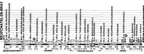 10h35 (Seine-Maritime) : Neufchâtel-en-Bray (km 0) - D60 Carr. N29 Côte de Neufchâtel (km 3.5-GPM4) - Saint-Germain-sur-Eaulnes (km 7) - Richemont (km 20) - Auberguimont (km 22.5) - Vieux-Rouen-sur-Bresle (km 27) - (Somme) : D96 Côte de Saint-Germain-sur-Bresle (km 29-GPM3) - Beaucamps-le-Vieux (km 32) - Liomer (près de) (km 35.5) - Brocourt - D211 Hornoy-le-Bourg (km 41.5) - Hallivilliers (km 46) - Molliens-Dreuil (km 51.5) - D211 Carr. D156 (km 52) - D156 Dreuil-les-Molliens (km 54) - Oissy (km 55) - Cavillon (km 58) - D95 Carr. D121 - D121 Fourdrinoy (km 60) - D121 Carr. D141 (km 62) - Picquigny (km 64) - N235 La Chaussée-Tirancourt (km 66) - D49 Carr. N1 (km 67.5) - Vignacourt (km 73.5) - Canaples (km 78.5) - Fieffes (km 81.5) - Côte de Montrelet (km 83.5-GPM4) - Candas (km 86) - Gézaincourt (km 91) - C22 Brétel-les-Gézaincourt (km 94) - Doullens (km 97-ravitaillement) - D5 Milly-lès-Doullens (km 98) - Bout-des-Prés-lès-Doullens (km 98.5) - Grouches (km 99) - Lucnuel (km 100) - Lucheux (km 102.5) - (Pas-de-Calais) : D75 Grand-Rullecourt (km 111) - Avesne-le-Comte (km 115.5) - Le Hameau (km 120) - D75 - D54 - D75 Tilloy-les-Hermaville (km 121.5) - Aubigny-en-Artois (km 126) - Cambligneul (km 129.5) - Servins (km 133.5) - Bouvigny-Boyeffles (km 138) - D75 Sains-en-Gohelle (km 141-sprint) - D75 Mazingarbe (km 143-ravitaillement) - Vermelles (km 146.5) - N41 Auchy-les-Mines (près de) (km 150.5) - D75 Carr. D167e (km 152.5) - (Nord) : D167e La Bassée (km 155) - D145 Marquillies (km 160) - Sainghin-en-Weppes (km 162.5) - Wavrin (km 166.5) - D62 - D241 Santes (km 170.5) - D63 Hallennes-les-Haubourdin (km 172.25) - D207 Carr. N41 (km 173) - Erquinghem-le-Sec (km 174.5) - D7 Englos (km 177.5) - D63 Ennetières-en-Weppes (km 179) - Capinghem (km 182) - D933 Carr. D952 (km 183.5) - D952 Prémesques (km 184) - Pérenchies (km 186.5) - D7 Carr. D36 (km 187.5) - D36 Quesnoy-sur-Deûle (km 191.5-sprint) - D36 - D149 - D64 - N17 Bondues (km 206.5-sprint) - Marcq-en-Baroeul (km 210) - D51 Mouvaux (km 212.5) - D9 Tourcoing (km 213.5) - Roubaix (km 215) - Croix (km 216) - Roubaix / Rue de Tourcoing (km 220.5-sprint) - Tourcoing / Bd. Gambetta (km 224).
