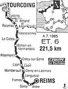 - Le début d'étape est extrêmement lent et seuls les sprints "catch" apportent quelque animation : Kelly gagne le 1er (km 39.5), Lieckens le 2ème (km 44). Verlinden abandonne tandis que Lammerts tente à plusieurs reprises de filer sans y parvenir. A Bohain-en-Vermandois (km 93.5), Jef Lieckens s'impose pour la 2ème fois devant un peloton qui compte maintenant 1/2 heure de retard sur l'horaire à 37 km/h. Morjean tombé le matin à Roubaix, abandonne à son tour. Au ravitaillement de Crécy-sur-Serre (km 136), le retard est passé à 3/4 d'heure.