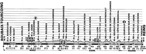 10h30 (Seine-Maritime) : Tourcoing - Roubaix - Lys-les-Lannoy - Lannoy - D90 Toufflers (km 0) - Sailly-lès-Lannoy (km 1.5) - Willems (km 4) - Baisieux (km 6.5) - Cysoing (km 11.5) - D955 Quennaumont (km 13) - Bourghelles (km 13.5) - Bachy (km 16) - Mouchin (km 19.5) - Rumegies (km 26) - Lecelles (km 29.5) - Saint-Amand (km 34.5) - D169 Carr. A23 (km 37.5) - Raismes (km 39.5-sprint) - Anzin (km 44-sprint) - Valenciennes (km 47.5) - D958 Marly-La Briquette (km 49.5) - Aulnoy-lès-Valenciennes (km 49.5) - Famars (km 52) - Querenaing (km 55.5) - Vendegies-sur-Écaillon (km 58.5) - Solesmes (km 67.5) - D955 Neuvilly (km 73) - Montay (km 76) - Le Cateau-Cambrésis (km 78) - D21 Honnechy (km 85) - Busigny (km 88) - (Aisne) : D8 Bohain-en-Vermandois (km 93.5-sprint) - D13 Séboncourt (km 98.5) - Fieulaine (près de) - D13 Carr. D70 (km 107) - D70 Neuvillette (km 111) - Origny-Sainte-Benoîte (km 113) - D131 Lucy-Ribemont (km 117) - Ribemont (km 118) - D12 Villers-le-Sec (km 122) - La Ferté-Chevrésis (km 128.5) - Montigny-sur-Crécy (km 132) - Crécy-sur-Serre (km 136-ravitaillement) - D967 Laon / Faubourg de Vaux (km 149-sprint) - Côte de Laon (km 152-GPM4) - Ardon (km 155) - Bruyère-et-Montbérault (km 159) - Côte de Montbérault (km 161) - Monthenault (km 163.5) - Chamouille (km 165) - Côte de Cerny-en-Laonnois (km 169-GPM4) - Vendresse-Beaulne (km 171) - Bourg-et-Comin (km 175) - D967 Carr. D22 (km 177) - D967 Côte de Longueval-Barbonval (km 181-GPM4) - (Marne) : D367 Fismes (km 187) - D386 Courville (km 191) - Crugny (km 194.5) - Serzy-et-Prin (km 196.5) - Savigny-sur-Ardre (km 198) - Faverolle-Coëmy (km 199.5) - Tramery (km 201.5) - Poilly (km 202.5) - Sarcy (km 204) - D606 Côte de l'Ardre (km 206-GPM4) - D606 Carr. D306 (km 206.5) - D306 Carr. D380 (km 207) - D380 Pargny-lès-Reims (km 213) - Tinqueux (km 219) - N31 Reims / Rue Libergier (km 221.5).