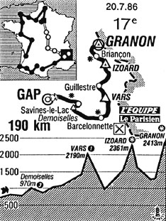 - Dans l'ascension du col, le groupe Mottet éclate alors que derrière, le maillot jaune Hinault est lâché dans le dernier tiers de l'escalade en compagnie de Contini et Zoetemelk. Au col d'Izoard (km 152), Chozas est toujours nettement en tête, à 10'43" Cabrera, Mottet et Fuerte, à 11'29" D.Garde, à 11'47" Bagot, à 12'15 Van der Velde, à 12'50" JC. Garde, à 14'02" Mujika, à 14'35' Millar, LeMond, Caritoux, Criquielion, Nevens, Madiot, Zimmermann, Agudelo, Bernard, Breu, Lejarreta, Boyer, Schepers, Rooks, Hampsten, P. Simon, à 15'48" Hinault, à 16'02" Herrera etc.