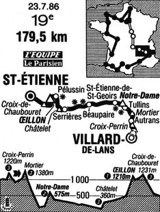 - Dans la montée de la Croix-de-Chaubouret, Herrera perd du terrain alors que Roche part en contre-attaque. En haut de la côte (km 161), Julian Gorospe en tête, à 3'05" Herrera, à 3'15" Roche, à 3'25", Hinault, Bernard, LeMond, Jimenez et Criquielion. Dans la descente, Roche rejoint et lâche Herrera. Bernard et LeMond rattrapent également le Colombien, le lâchent et reviennent sur Stephen Roche. Le peloton "Hinault" rejoint ce trio peu avant le panneau des dix derniers kilomètres. Seul Gorospe reste à l'avant avec encore 3' d'avance. Dans le plongée vers Saint-Étienne il n'est pas inquiété et remporte une fort belle victoire devant Anderson et D. Garde sortis d'un peloton d'une cinquantaine d'unités. Le reste des coureurs arrivent par paquets.