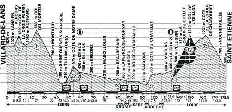 11h15 (Isère) : Villard de Lans - D531 La Molière (km 0) - Les Geymonds (km 0.5) - Le Bouilly (km 3.5) - Lans-en-Vercors (km 6) - D106 Col de la Croix-Perrin (km 9.5-GPM3) - Autrans (km 15.5) - D218 Ebertière (km 17.5) - Côte du Mortier (km 24-GPM3) - Les Coings (km 32.5) - Montaud (km 36) - Le Git (km 41.5) - Saint-Quentin-sur-Isère (km 43) - D45 Tullins-Fures (km 48.5-sprint) - Côte de Notre-Dame (km 54-GPM2) - D73 Izeaux (km 58.5) - D519 Sillans (km 61.5-sprint) - Saint-Étienne-de-St-Geoirs (km 66) - D518 Brézins (km 68.5) - Le Rival - D519 Marcilloles (km 79) - St-Barthélémy-de-Beaurepaire (km 87) - Beaurepaire (km 90-ravitaillement) - (Drôme) : Montanay (km 92.5) - Lapeyrouse-Mornay (km 94.5-sprint) - (Isère) : Jarcieu (km 99) - Bouge-Chambalud (km 103-sprint) - Les Falques - D82 Sablons (km 112) - (Ardèche) : Serrières (km 114) - Côte de Châtelet (km 117.5-GPM3) - D242 Châtelet (km 118.5) - Félines (km 119.5) - (Loire) : D19 Limonne - Maclas (km 129.5) - Goely - Brossin - La Garde - La Chaize (km 133.5) - C5 Pélussin (km 138-sprint) - D63 Soyère (km 131) - La Massée - Le Priel - La Croix-Collet (km 145) - Col de l'Oeillon (km 149-GPM1) - D8 Biorama (km 161) - Croix de Chaubouret (km 161.5-GPM3) - Le Bessat (km 163) - Rochetaillée (km 173.5) - Saint-Étienne / entrée (km 176.5) - Saint-Étienne / Cours Fauriel (km 179.5).