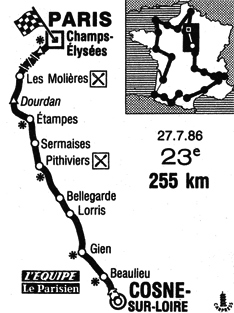 - Le peloton est pressé d'arriver à Paris et l'allure est relevée sur la première partie de l'étape. Dirk De Wolf s'adjuge tous les "Catch", à l'exception de celui d'Étampes. Au km 14, Knetemann porte une attaque. Le Néerlandais est rejoint par Madiot, Van der Velde, De Wolf, Bérard, Rooks et Claveyrolat, puis... par tout le peloton. Au km 180, il faut signaler une chute collective sans gravité où le maillot jaune LeMond est un peu attardé mais tout rentre dans l'ordre rapidement.