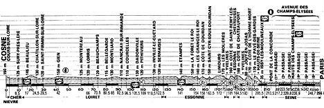 9h40 (Nièvre) : Cosne-sur-Loire - (Cher) : D955 Les Fouchards (km 0) - D751 Menestreau (km 3.5) - Léré (km 8) - Sury-près-Léré (km 9.5) - Belleville-sur-Loire (km 12) - (Loiret) : D951 Beaulieu (km 17-sprint) - Châtillon-sur-Loire (km 24.5) - Saint-Firmin-sur-Loire (km 29.5) - Gien (km 42-sprint) - Montereau (km 60) - Lorris (km 86) - Beauchamps (km 73.5) - N60 Bellegarde (km 80.5) - D44 Montliard (km 85) - Boiscommun (km 87.5) - Nancray-sur-Almard (km 92.5) - La Nerville (km 94) - Courcelles (km 96.5) - D950 Dadonville (km 105.5-sprint) - D921 Pithiviers (km 109-ravitaillement) - Lalainville (km 114.5) - Intville-la-Guétard (km 118.5) - Sermaises (km 122.5) - (Essonne) : D721 Étampes (km 141-sprint) - D836 La Forêt-le-Roi (km 150) - Les Granges-le-Roi (km 154) - Côte de Dourdan (km 158-GPM3) - D938 Saint-Cyr-sur-Dourdan (km 182) - Angervilliers (km 165) - Forges-les-Bains (km 166) - Bajolet (km 166.5) - D968 Limours (km 172) - D838 Les Molières (km 175-ravitaillement) - (Yvelines) : D938 St-Rémy-lès-Chevreuse (km 179.5) - Côte de Saint-Rémy (km 181-GPM4) - Cresselly (km 182.5) - Châteaufort (km 184) - (Essonne) : Côte de Châteaufort (km 184.5-GPM4) - (Yvelines) : Toussus-le-Noble (km 186.5) - N446 Jouy-en-Josas (km 193) - D117 Côte de l'Homme-Mort (km 195) - Vélizy (km 196.5) - Vélizy-Villacoublay(km 197) - Viroflay (km 197.5) - Vélizy-le-Bas - (Hauts-de-Seine) : Chaville (km 196.5) - Le Pavé des Gardes (km 200-GPM3) - Sèvres (km 200.5) - Meudon (km 202) - Issy-les-Moulineaux (km 205.5-sprint) - N187 Paris-Quai A.Citroën (km 208.5) - Pont de la Concorde (km 213.5) - Av. des Champs-Elysées / 1er passage (km 217.2) - Av. des Champs-Elysées / 2ème passage (km 223.5) - Av. des Champs-Elysées / 3ème passage (km 217.8) - Hauts des Champs-Elysées (km 230.9-sprint) - Av. des Champs-Elysées / 4ème passage (km 238.1) - Av. des Champs-Elysées / 5ème passage (km 242.4) - Av. des Champs-Elysées / 6ème passage (km 248.7) - Paris / Champs-Elysées (km 255).