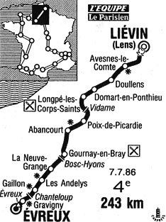 - A l'entrée d'Évreux, le duo est toujours devant mais les Panasonic exercent une forte pression et alors que le peloton revient sur leurs talons, Ruiz Cabestany attaque et rejoint le duo. Simon se relève, les deux Espagnols persistent avec 10" d'avance. A la flamme rouge, Echave se relève mais Pello Ruiz Cabestany conserve 2" sur les sprinters. Jos Lammertink a chuté et doit abandonner (fracture du crâne).