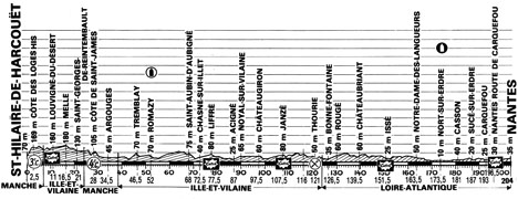 11h08 (Manche) : St-Hilaire-du-Harcouët (km 0) - D977 Côte des Loges (km 2.5-GPM3) - Les Loges-Marchais (km 3.5) - (Ille-et-Vilaine) : D177 Louvigné-du-Désert (km 11-sprint) - Melle (km 16.5) - St-Georges-de-Reintembault (km 21) - (Manche) : D30 Saint-James (km 28-GPM4) - D12 Argouges (km 34.5) - (Ille-et-Vilaine) :N175 Tremblay (km 46.5) - Romazy (km 52) - Saint-Aubin-d'Aubige (km 68) - D105 Chasnes-sur-Illet (km 72.5) - D106 Liffré (km 77.5-sprint) - D92 Acigne (km 87) - Noyat-sur-Vilaine (km 90) - D32 Châteaugiron (km 97.5) - D92 Janzé (km 107.5-sprint) - D163 Thourie (km 121-ravitaillement) - (Loire-Atlantique) : D163 Bonne-Fontaine (km 126.5) - Rouge (km 130) - Châteaubrlant (km 139.5) - D35 Issé (km 151.5-sprint) - D69 Notre-Dame-des-Langueurs (km 183.5) - Nort-sur-Erdre (km 173.5) - D26 Caisson (km 181) - D37 Suce-sur-Erdre (km 187) - Carquefou (km 193) - D178 Saint-Joseph-de-Porterie (km 195.5) - Nantes / entrée (km 196.5-sprint) - Nantes / Bd. des Américains (km 204).