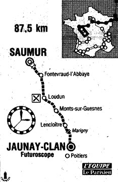 (Maine-et-Loire) : Saumur (km 0) - D145 Côte du Château (km 2.5) - Champigny (km 8) - Fontevraud-I'Abbaye (km 15) - (Vienne) : D147 - Loudun (km 36-ravitaillement) - D14 Rossay (km 41.5) - La Roche-Rigault (km 44.5 ) - Geneton (km 45) - D24 Monts-sur-Guesnes (km 51) - D14 Vayolles (km 54) - Berthegon (km 55.5) - D73 Savigny-sous-Faye (km 59.5) - Cernay (km 64.5) - D20 L'Encloître (km 67.5) - Ouzilly (km 72.5) - Côte de Marigny-Brizay (km 76-GPM4) - Marigny-Brizay (km 77) - Saint-Léger-la-Palu (km 80) - Parigny (km 81.5) - Jaunay-Clan (km 85) - Futuroscope (km 87.5).