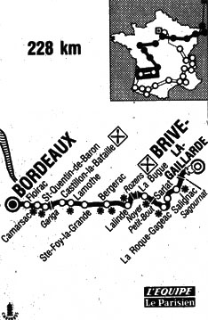 10h10 (Corrèze) : Brive (km 0) - N89 Larche (km 6) - (Dordogne) : lieu-dit Champ d'Alou (km 6.5) - D60 lieu-dit La Bonneterie - lieu-dit Le Rouquet - (Corrèze) : Côte de Sagournat (km 11.5-GPM4) - (Dordogne) : lieu-dit Sagournat - Chavagnac (km 13) - lieu-dit Mas Del Sartre - lieu-dit Laval (km 22) - Salignac (km 29.5-prime) - lieu-dit Le Poujol - D704 lieu dit Les Presses - Sarlat (km 46-prime) - D46 lieu-dit Vitrac-Port (km 53.5) - D703 lieu-dit Gaillardou - La Roque Gageac (km 59.5-prime) - Beynac (km 64) - Castels (km 73.5) - Saint-Cyprien (km 74) - D49 Côte du Petit-Bout (km 77-GPM4) - D35 Campagne (km 83) - Le Bugue (km 84-prime, km 87-ravitaillement) - Côte du Noyer (km 92-GPM4) - D703 - Pezuls (km 99) - Côte de Rozens (km 101.5) - Sauvebœuf (km 109) - Lalinde (km 114-sprint) - D660 Pont de Couze (km 115.5) - Saint-Capraize de Lalinde (km 119.5) - Tuilières (km 122) - Mouleydier (km 125-prime) - Creysse (km 127) - Z.I. de Bergerac (km 132-prime) - Bergerac (km 135.5-sprint) - D936 La Monzie-Saint-Martin (km 142.5) - Gardonne (km 146) - (Gironde) : Pineuilh (km 155) - Sainte-Foy-la-Grande (km 155.5) - (Dordogne) : Pont de Sainte-Foy et Ponchapt (km 156.5) - Saint-Antoine-de-Breuilh (km 160.5) - Montcarret tête noire (km 167.5) - Lamothe (km 170.5-sprint) - (Gironde) : Castillon-la-Bataille (km 176.5-ravitaillement) - Saint-Pey-d'Armens (km 182) - Branne (km 189) - Côte de Gariga (km 190.5-GPM4) - D936 - Saint-Quentin-de-Baron (km 199-sprint) - Camarsac (km 205-sprint) - Les Bons-Enfants (km 211.5) - Fargues-Saint-Hilaire (km 214) - Tresses-Meiac (km 215.5) - Floirac (km 217.5) - Cenon (km 218) - Bordeaux / Pont Saint-Jean (km 222) - Bordeaux / entrée du circuit (km 224.5) - Bordeaux / 1er passage (km 226) - Bordeaux / Quai Louis XVIII (km 218).