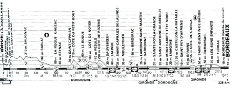 rythmé par les côtes, les sprints et les nombreuses primes attribuées dans le Périgord. Garde franchit en tête la côte de Sagournat au km 11.5. Au km 30, Sanders remporte la prime de Salignac puis Elliott celle de Sarlat au km 46 et de La Roque-Gageac au km 60. Juste avant ce sprint, l'évènement principal de ce début d'étape est une chute collective au km 57 dont Sean Kelly est victime. Il repart avec ses équipiers mais doit abandonner au km 75.