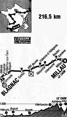 10h30 (Haute-Garonne) : Blagnac (km 0) - D2 Beauzelle (km 2) - Seilh (km 5.5) - Grenade-aur-Garonne (km 14.5-sprint) - D17 Ondes (km 17.5) - D29 Côte des Hébrails (km 22) - Fronton (km 27.5) - Villaudric (km 32) - Magnanac (km 37) - D29D Villemur-sur-Tarn (km 39) - D14 Côte de Buguet (km 41-GPM4) - (Tarn) : D 999 - lieu-dit Ste-Cécile-d'Aves (km 75) - Galllac (km 80.5-sprint) - Marssac-sur-Tarn (km 91) - Albi (km 101-ravitaillement) - D 903 Côte de Bezelle (km 108.5-GPM4) - Commune d'Andouque (km 117.5) - Gaulène (km 123.5) - Valence-d'Albigeois (km 128.5-sprint) - (Aveyron) : Saint-Jean-Delnous (km 138.5) - Réquista (km 141.5-sprint) - D44 L'Hôpital-Bellegarde (km 146) - Lestrade (km 155.5) - Villefranche-de-Panat (km 161) - Côte de Villefranche (km 166-GPM4) - Les Canabières (km 175.5) - Bouloc (km 180) - D30 Bouloc (km 182.5) - Saint-Beauzely (km 191.5) - Côte d'Azinières (km 196.5-GPM3) - D 911 Saint-Germain (km 201.5) - Millau (km 207.5) - D110 - D 110 Millau / Le Cade (km 216.5).