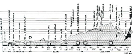 - La côte des Hébrails au km 22 est franchie en premier par Brun. Régis Clère, repêché hier de l'élimination, s'échappe à l'occasion du sprint de Fronton (km 27). Le peloton adopte un tempo rapide. Malgré cela l'écart augmente régulièrement : 1'30" en haut de la côte de Buguet (km 41). Bagot tente de partir en contre-attaque. Il est repris quelques kilomètres plus loin. Dès la jonction, le peloton ralentit l'allure et Clère prend ses aises : 4'53" au km 52, 10'29" au km 63, 17'35" au "catch" de Gaillac (km 81) où Colotti, souffrant du genou, "met la flèche à droite" (abandonne). Il portait le maillot rouge désignant le leader des sprints "catch".