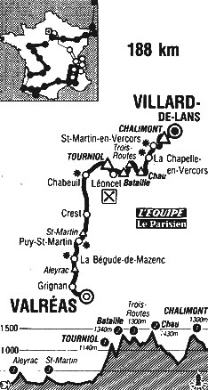 - Au km 59, Mujica se détache et un groupe de 17 coureurs se forme en tête : Mujica, Stevenhaagen, Achermann, M. Madiot, Vallet, Lemarchand, De Rooy, Imboden, Marie, Bauer, Schepers, Garde, Sanders, Brun, Castillo, Ducrot & Van Vliet. Au "catch" de Chabeuil (km 74) gagné par Van Vliet, ce groupe précède le peloton de 2'14". Au km 88, dans les premiers hectomètres du col de Tourniol (ascension inédite sur le Tour), Marie est distancé du groupe de tête. Derrière, Omar Hernandez sort du peloton. Roche attaque à plusieurs reprises mais Bernard contre à chaque fois.