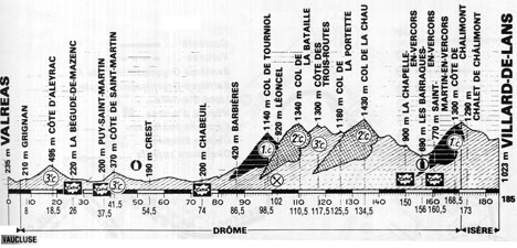 11h10 (Vaucluse) : Valréas (km 0) - D941 Grillon (km 4) - (Drôme) : D541 Grignan (km 8) - D56 - D24 Salles-sous-Bois (près de) (km 13) - D9 Côte d'Aleyrac (km 16.5-GPM3) - La Bégude de Mazenc (km 26-sprint) - Charois (km 31.5) - Cléon d'Andran (km 34) - D6 Puy-Saint-Martin (km 37.5-sprint) - Côte de Saint-Martin (km 41.5-GPM3) - D538 Crest (km 54.5) - D93 - D538 - Chabeuil (km 74-sprint) - D68 - D119 Charpey (km 81.5) - D101 Barbières (km 86.5) - Col de Tourniol (km 98.5-GPM1) - Léoncel (km 102-ravitaillement) - D199 Col de la Bataille (km 110.5-GPM2) - Côte des 3-Routes (km 117.5-GPM3) - Col de la Portette (km 125.5) - D76 Col de Lachau (km 134.5-GPM2) - D178 Col de Proncel (km 143.5) - La Chapelle-en-Vercors (km 150-sprint) - D518 Les Barraques-en-Vercors (km 156) - D103 Saint-Martin-en-Vercors (km 160-sprint) - Côte de Chalimont (km 168.5) - (Isère) : V3 Châlet de Chalimont (km 173-GPM1) - D531 Villard-de-Lans / Av. du Général de Gaulle (km 185).