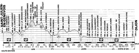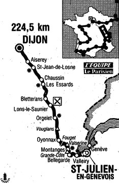 10h45 (Haute-Savoie) - Saint-Julien en Genevois (km 0) - D134 Thairy - N206 Viry (km 3.5) - Essertet (km 5.5) - Valleiry (km 9.5-sprint) - Vulbens-Faramaz (km 12) - Pont-Carnot (km 16) - (Ain) : Longeray (km 20) - Bellegarde (km 28.5) - D 991 Lancrans (km 31) - La Grande-Côte (km 32-GPM3) - Confort (km 34) - La Mulaz (km 35.5) - D14A Montanges (km 38.5-sprint) - D 14 Champfromier (km 42.5) - D48 Communal (km 43.5) - Côte de Valserine (km 48-GPM3) - Giron (km 51) - D33 Belleydoux (km 57.5) - D13 LePavillon-Echallon (km 61) - Côte de Fouget (km 65.5-GPM4) - Oyonnax (km 73) - Dortan (km 80.5) - D 936 Uffel (km 83) - (Jura) : D60E Chancia (km 85) - D60 Côte de Vouglans (km 94.5-GPM3) - Cernon (km 95.5) - D3 Onoz (km 102) - D60 - D470 Orgelet (km 112-sprint) - La Thoreigne (km 115) - D52 lieu-dit Le Pavillon (km 120) - Montaigu (km 129) - Lons-le-Saunier (km 132-ravitaillement) - N83 Montmorot (km 134) - Villevieux (km 143.5) - Bietterans (km 145) - D33 Relans (km 147) - Commenailles (km 152) - Chaumergy (km 157) - D468 La Chassagne (km 161) - Rye (km 162.5) - Les Essards (km 167-sprint) - Asnans (km 171.5) - Peseux (km 178) - Saint-Aubin (km 183.5) - (Côte d'Or) : D 938 Maison-Dieu (km 192) - Losnes (km 193-sprint) - Saint-Jean-de-Losnes (km 193.5) - Saint-Usage (km 194.5) - Brazey-en-Plaine (km 198) - Chapelle (km 201) - Aiserey (km 205.5) - Longecourt-en-Plaine (km 208.5) - Thorey-en-Plaine (km 211) - D996 Longvic (km 221) - Dijon / cours Gen. de Gaulle (km 224.5).