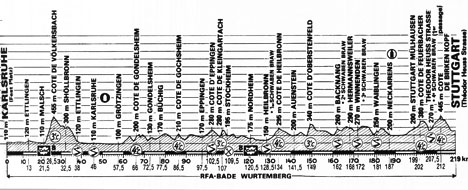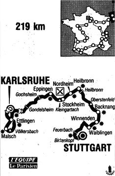 12h00 (RFA) - Karlsruhe / Fest Platz (km 0) - Malsch (km 21.5-rush) - Côte de Volkersbach (km 26.5-GPM3) - Ettlingen (km 38) - Karlsruhe (km 46) - Côte de Gondelsheim (km 66-GPM4) - Côte de Gohsheim (km 86.5-GPM4) - Eppingen (km 102.5) - Stockheim (ravitaillement) - Côte de Kleingartach (km 107-GPM3) - Nordheim (km 120.5-rush) - Côte d'Heilbronn (km 134-GPM4) - Côte d'Orberstenfeld (km 149-GPM3) - Backnang (km 162) - Winnenden - Waiblingen (km 181) -