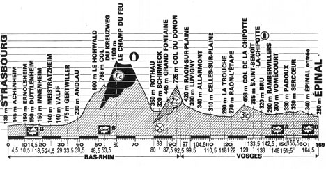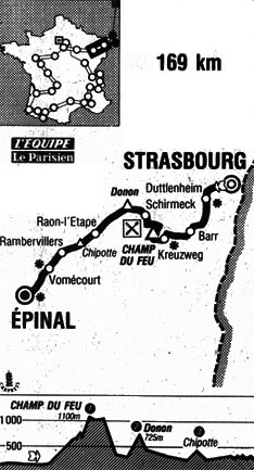 ![]() lundi 6 juillet 1987 ![]() (Bas-Rhin) : Strasbourg - N4 Eckolsheim (km 0) - D45 Wolfisheim (km 1.5) - Obershaeffolsheim (km 2.5) - Achenheim (km 4.5) - Breuschwickersheim (km 6) - D793 Ernolsheim (km 10.5) - Duttlenheim (km 14.5-sprint) - Innenheim (km 18.5) - D215 Krantergersheim (km 21) - Meistratzheim (km 24.5) - Valff (km 29) - D706 Bourgheim (km 31) - N422 Gertwiller (km 33.5) - D425 Barr (km 35) - Eischoffen (km 37.5) - Andlau (km 39.5) - Le Howald (km 48.5) - Col du Kreuzweg (km 53.5-sprint) - D57 Col de la Charbonnière (km 58) - D214 Col du Champ du Feu (km 60-GPM1) - Rothau (km 80) - N420 La Broque (km 82) - Schirmeck (km 83-ravitaillement) - D392 Wackenbach (km 86) - Grand-Fontaine (km 87.5) - Col du Donon (km 92.5-GPM2) - (Vosges) : Raon-sur-Plaine (km 97) - Luvigny (km 99.5) - Vexaincourt (km 101.5) - Allarmont (km 104.5) - D392A Celles-sur-Plaine (km 110.5) - La Trouche (km 118) - Raon-l'Étape (km 122) - D159bis Col de la Chipotte (km 129-GPM3) - Saint-Benoît-la-Chipotte (km 133.5) - Bru (km 138) - D32 Rambervillers (km 142.5) - D46 Vomecourt (km 146-sprint) - Padoux (km 151.5) - Sercœur (km 155.5) - entrée Épinal (km 164.5-sprint) - Épinal / Av. de Provence (km 169). ![]() ![]() ![]() 202 partants. Météo : temps ensoleillé et chaud. - Le premier sprint "catch" est remporté par Colotti devant Jurco et Wojtinek, lequel prend 1 pt pour le maillot vert et rejoint en tête de ce classement Jorg Müller. Bagot attaque au km 20. Ce sont d'abord Vallet, puis par Nijboer, Hermans, Alcala, Duclos-Lassalle, Lavainne, Devos, Ruttimann & Dominguez. Ghirotto tente également de sortir mais ne parvient pas à faire la jonction. 10 coureurs en tête. - L'écart grandit car encore une fois, aucune équipe ne veut faire le travail : 1'23" au pied du col du Kreuzweg (km 40), 2'28" cinq kilomètres plus loin et 2'02" au 2ème catch au sommet du Kreuzweg (km 54) gagné par Hermans. Une courte descente et les coureurs attaquent l'ascension du Champ de Feu avec quelques passages à 9%. Hermans, Duclos-Lassalle, Nijboer et Vallet sont distancés. Derrière, Moncada sort du peloton au km 56. Au sommet (km 60) : Devos & Ruttimann, à 2" Alcala, à 6" Bagot, Lavainne & Dominguez, à 15" Vallet, à 45" Duclos-Lassalle, Nijboer & Moncada, à 1'02" le peloton. Dans la descente, les six premiers se regroupent et poursuivent leur effort. - Au bas de la descente, à Rothau (km 80), Devos, Ruttimann, Alcala, Bagot, Lavainne et Dominguez précèdent de 1"06" Vallet, Duclos-Lassalle, Nijboer et Moncada, qui a rejoint le groupe intercalé, et de 3'18" le peloton. Dans la montée du col du Donon (cat.2), Moncada part seul, se rapproche du groupe de tête et finalement fait la jonction au km 93, en vue du sommet où Alcala passe en tête avec dans son sillage les six autres échappés. Le peloton a maintenant 5'34" de retard. - Le groupe de 7 coopére avec quelques réticences de Lavainne et Devos. Vallet et Duclos-Lassalle, toujours intercalés, reprennent du terrain : 1'09" à La Trouche au km 118, où le retard du peloton est de 7'40". Les Carrera se décident à prendre en main la poursuite tandis que Vallet et Duclos-Lassalle réussissent à faire la jonction en tête au pied du col de la Chipotte (km 127). Au sommet, Alcala passe le premier du groupe des 9, le peloton est revenu à 4'51". Au km 137, Lavainne se détache du groupe de tête tandis qu'à l'arrière, Steve Bauer est retardé dans une chute au km 138. Lavainne passe devant le catch de Vomecourt (km 146) avec 36" sur ses anciens compagnons et 4'37" sur le peloton. Alcala part en contre au km 148 à la poursuite de Lavainne. - Lavainne résiste à Alcala et au peloton : 1'21" et 4'00" à dix bornes du but. Il engrange encore au catch d'Épinal et gagne l'étape en costaud. Maechler garde le maillot jaune pour 36". Le Nordiste Bruno Wojtinek prend le maillot vert et les équipes des sprinters sont encore en échec. ![]() Étape : ![]() 1. Christophe Lavainne (Fra) en 4h12'57" (moy : 42.458 km/h) 2. Raul Alcala (Mex) à 1'34" 3. Manuel-Jorge Dominguez (Esp) à 2'34" 4. Gilbert Duclos-Lassalle (Fra) 5. Jean-Claude Bagot (Fra) 6. Nicki Rüttimann (Sui) 7. Hendrik Devos (Bel) 8. Bernard Vallet (Fra) 9. Gerardo Moncada (Col) 10. Jean-Paul Van Poppel (Hol) à 2'37" 11. Sean Kelly (Irl) 12. Bruno Wojtinek (Fra) 13. Jozef Lieckens (Bel) 14. Rudy Dhaenens (Bel) 15. Johan Capiot (Bel) 16. Michel Vermote (Bel) 17. Jeff Pierce (Usa) 18. Dietrich Thurau (All) 19. Jose Luis Navarro (Esp) 20. Jean-Philippe Vandenbrande (Bel) 21. Marc Gomez (Fra) 22. Andrew Hampsten (Usa) 23. Jan Goessens (Bel) 24. Marc Sergeant (Bel) 25. Thierry Marie (Fra) 26. Gilles Sanders (Fra) 27. Jorg Müller (Sui) 28. Eric Van Lancker (Bel) 29. Jonathan Boyer (Usa) 30. Thierry Claveyrolat (Fra) 31. Julio Cesar Cadena (Col) 32. Jérôme Simon (Fra) 33. Pascal Simon (Fra) 34. Martial Gayant (Fra) 35. Gerrie Knetemann (Hol) 36. Pello Ruiz Cabestany (Esp) 37. Teun Van Vliet (Hol) 38. Roque De la Cruz (Esp) 39. Jean-René Bernaudeau (Fra) 40. Phil Anderson (Aus) 41. André Chappuis (Fra) 42. Omar Hernandez (Col) 43. Claude Criquielion (Bel) 44. Charly Mottet (Fra) 45. Laurent Fignon (Fra) 46. Stephen Roche (Irl) 47. Dag-Otto Lauritzen (Nor) 48. Pascal Poisson (Fra) 49. Alan Peiper (Aus) 50. Kim Andersen (Dan) 51. Peter Hilse (All) 52. Erich Maechler (Sui) 53. Robert Millar (Gbr) 54. Denis Roux (Fra) 55. Gilles Mas (Fra) 56. Giancarlo Perini (Ita) 57. Samuel Cabrera (Col) 58. Bernard Gavillet (Sui) 59. Rudy Patry (Bel) 60. Eduardo Chozas (Esp) 61. Kvetoslav Palov (Tch) 62. Pedro Delgado (Esp) 63. Federico Echave (Esp) 64. Eric Caritoux (Fra) 65. Jean-François Bernard (Fra) 66. Bruno Cornillet (Fra) 67. Davis Phinney (Usa) 68. Dominique Garde (Fra) 69. Robert Forest (Fra) 70. Celestino Prieto (Esp) 71. Acacio Da Silva (Por) 72. Jesus Hernandez Ubeda (Esp) 73. Charly Bérard (Fra) 74. Rafael Acevedo (Col) 75. Nestor Mora (Col) 76. Jesper Skibby (Dan) 77. Jean-François Rault (Fr