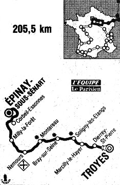 11h00 (Aube) : Troyes - La Chapelle-Saint-Luc (km 0) - D60 - Grange-l'Évêque (km 6) - Dierrey-Saint-Pierre (km 15.5) - D31 Dierrey-Saint-Julien (km 17.5) - D95 Mesnil-Saint-Loup (km 23) - D23 Faux-Villecerf (km 27) - Saint-Lupien (km 31.5) - D7 Marcilly-le-Hayer (km 37) - D374 Bercenay-le-Hayer (km 40) - Bourdenay (km 42) - Trancault (km 46) - Soligny-les-Étangs (km 50-sprint) - D51 Bouy-sur-Morin (km 52) - D68 Trainel (km 56) - (Seine-et-Marne) : D49 Fontaine-Fourches (km 60) - D59 Villuis (km 63) - Villenauxe-la-Petite (km 66.5) - Bray-sur-Seine (km 73-sprint) - D411 Bazoches-les-Bray (km 77.5) - La Tombe (km 85) - Marolles-sur-Seine (km 89) - D18 Saint-Germain-Laval (km 94) - D403 Montereau (km 97.5-sprint) - Varennes-sur-Seine (km 99.5) - Ville-Saint-Jacques (km 104.5) - Villecerf (km 108.5) - Villemer (km 111.5) - Nonville (km 115) - Darvault (km 119.5) - Nemours (km 122.5-ravitaillement) - Saint-Pierre-les-Nemours (km 124) - D16 Larchant (km 131) - La Chapelle-la-Reine (km 137) - Le Vaudoue (km 143) - (Essonne) : D141E Milly-la-Forêt (km 149) - D948 Moigny-sur-École (km 153.5) - D948 - D74 Chevannes (km 165.5) - D153 Mennecy (km 169-sprint) - Écharcon (km 172.5) - D26 - D153 - Courcouronnes (km 178.5) - N446 Corbeil-Essonnes (près de) - N447 - D33 Tigery (près de) - Croix-de-Villeroy (km 188.) - D33bis Quincy-sous-Sénart (km 190) - (Seine-et-Marne) : Combs-la-Ville (km 191.5) - (Essonne) : D48E Varennes-Jarcy (km 194.5-sprint) - (Val-de-Marne) : D540 Perrigny-sur-Yerres (km 195.5) - Mandres-les-Roses (km 197) - D33E Villecresnes (km 199) - (Essonne) : D33 Yerres (km 201) - D94 Brunoy (km 203) - Épinay-sous-Sénart /Av. du Gén. de Gaulle (km 205.5).