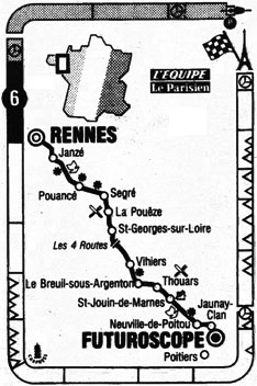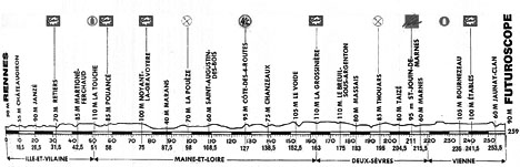 09h10 (Ille-et-Vilaine) : Rennes (km 0) - Chateaugiron (km 10.5) - D92 Janze (km 20.5) - D41 Le Theil-de-Bretagne (km 28.5) - Retiers (km 31.5-sprint) - D178 Martigne-Ferchaud (km 42.5) - (Maine-et-Loire) : D3 La Touche (km 51) - N171 Pouancé (km 58-sprint) - D775 Vergonnes (km 65) - Bel Air Combrée (km 72.5) - La Crête des Landes (km 73.5) - Noyant-la-Gravoyère (km 75-sprint) - Segré (km 82) - D961 Marans (km 87.5) - Vern d'Anjou (km 92.5) - La Pouëze (km 98-ravitaillement) - Becon-les-Granits (km 104) - Saint-Augustin-des-Bois (km 108.5) - Saint-Georges-sur-Loire (km 115) - Chalonnes-sur-Loire (km 122) - Côte des Quatre-Routes (km 127-GPM4) - D121 Chanzeaux (km 138.5) - Valanjou (km 145) - D54 Le Voide (km 152.5) - Vihiers (km 155) - D748 La Reveillière (km 161) - La Grossinière (km 163-sprint) - (Seux-Sèvres) : D748 La Grippière (km 164.5) - La Fougereuse (km 168.5) - Le Breuil-sous-Argenton (km 175) - D759 Massais (km 183) - Vrines (km 191) - Thouars (km 195-ravitaillement) - D37 Taize (km 204.5) - Saint-Jouin-de-Marnes (km 211) - Marnes (km 215.5) - (Vienne) : D18 Bournezeau (km 235) - Etables (km 241.5-sprint) - N147 Neuville-de-Poitou (km 245) - D62 Jaunay-Clan (km 253.5) - D20 Chasseneuil-de-Poitou (km 256) - Futuroscope (km 259).